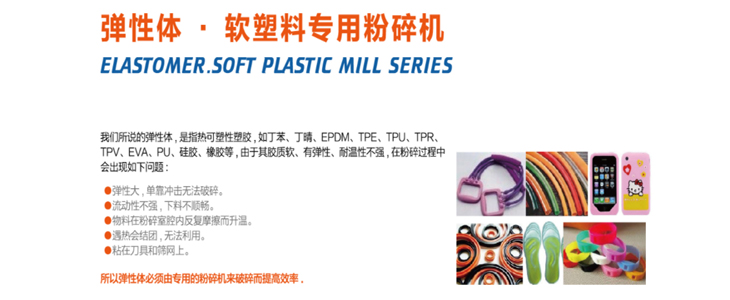 本系列可以粉碎:TPU,TPE,TPR,TPV,PU.彈性體塑料粉碎機(jī),硅膠,彈性體(TPU,TPR,TPE,TPO,TPB,TPI,TPF,PU,SBS,SIS,SEBS,SEPS),EVA(發(fā)泡),等橡膠的粉碎。