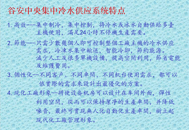 中央冷水系統(tǒng)適用于降溫,恒溫等工業(yè)冷卻領(lǐng)域,集中控制,雙段冷卻,由點(diǎn)及面,節(jié)省能源,彈性利用空間,是現(xiàn)代工業(yè)提高生產(chǎn)效率和改善生產(chǎn)質(zhì)量的不可或缺的配套設(shè)備。